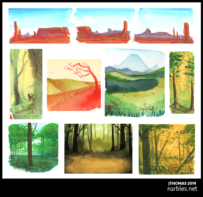 Landscape studies for an illustration series. Gouache.